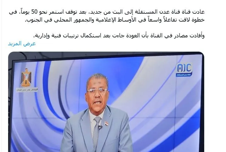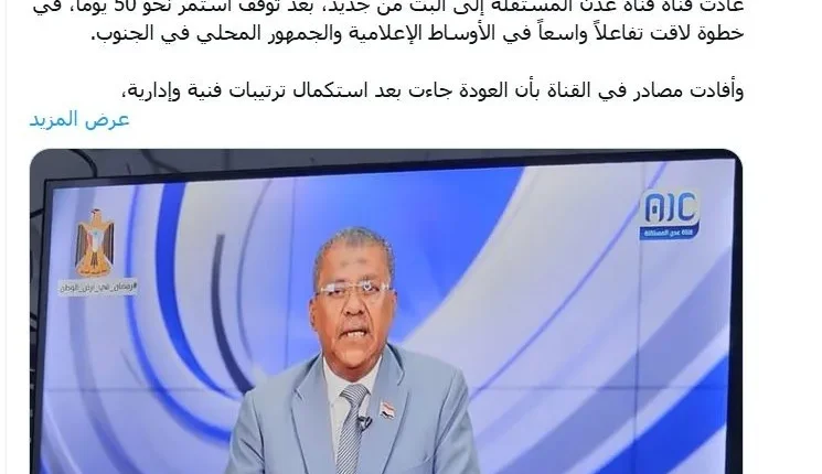 وأكد القيادي في المجلس، المقيم في أبو ظبي، هاني مسهور، استئناف بث قناة عدن المستقلة بعد توقف دام 50 يوماً، مشيراً إلى انطلاقة جديدة للقناة، ونشر صوراً لمذيعين جدد ضمن طاقمها الإعلامي.