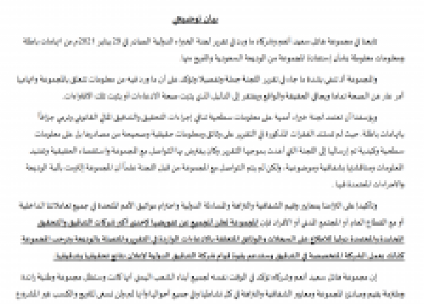 والمجموعة أن تنفي بشدة ما جاء في تقرير اللجنة جملة وتفصيلا وتؤكد على أن ما ورد فيه من معلومات تتعلق بالمجموعة واتهامها أمر عار عن الصحة تماما ويجافي الحقيقة والواقع ويفتقر إلى الدليل الذي يثبت صحة الادعاءات أو يثبت تلك الافتراءات.