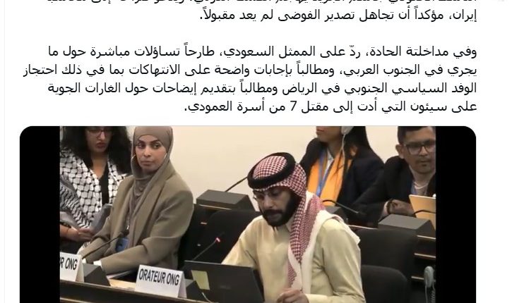 وبحسب مصادر حقوقية، ركّزت الحملة على تسليط الضوء على ما وُصف بـ”انتهاكات سعودية“ في مناطق جنوب اليمن، مع الترويج لمقاطع من جلسات المجلس تُظهر خطاباً إماراتياً يربط بين مكافحة “التطرف الإسلامي” وانتقاد السياسات السعودية، بالتوازي مع الإشارة إلى إيران في سياق الخطاب.
