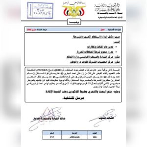 وبحسب التعميم الصادر برقم (257) عن وكيل قطاع الأمن والشرطة، فقد تم توجيه مدراء الشرطة في المناطق الخاضعة لسيطرة القوات الموالية للسعودية بمتابعة ورصد كل من: علي أحمد الجفري، وسالم أحمد بن دغار، وعلي فرج الطمبشي، مع العمل على اعتقالهم فور ضبطهم في أي منفذ أو نقطة أمنية.
