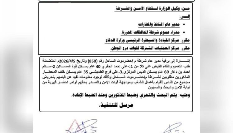 وشددت التعليمات على ضرورة تكثيف عمليات البحث والتحري، وعدم التهاون في تنفيذ أوامر الضبط، في مؤشر على توجه أمني أكثر صرامة تجاه تحركات المجلس الانتقالي في المنطقة.