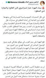 وأوضح المسؤول في وزارة النفط والمعادن السعودية، منصور المالك، في تدوينة على منصة “إكس”، أن التحولات الجيوسياسية المتسارعة تفرض إعادة النظر في طرق نقل الطاقة والتجارة، خصوصاً بعيداً عن نقاط الاختناق الحيوية مثل مضيق باب المندب.