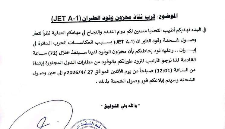 وفي ضوء ذلك، دعت الشركة “الخطوط الجوية اليمنية” وبقية شركات الطيران العاملة إلى اتخاذ تدابير عاجلة لتأمين احتياجاتها من الوقود، من خلال التزود من مطارات الدول المجاورة، وذلك اعتباراً من الساعة 12:01 صباح يوم الاثنين الموافق 27 أبريل 2026، بهدف تفادي أي اضطراب أو توقف مفاجئ في حركة الرحلات الجوية.