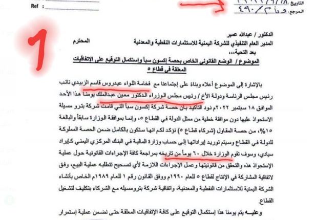 وتضمنت إحدى الوثائق وهي عبارة عن رسالة موجهه من وزير النفط في حكومة معين سعيد الشماسي إلى مدير عام الشركة اليمنية للاستثمارات النفطية وعود بتوريد عائدات القطاع إلى البنك المركزي في عدن.